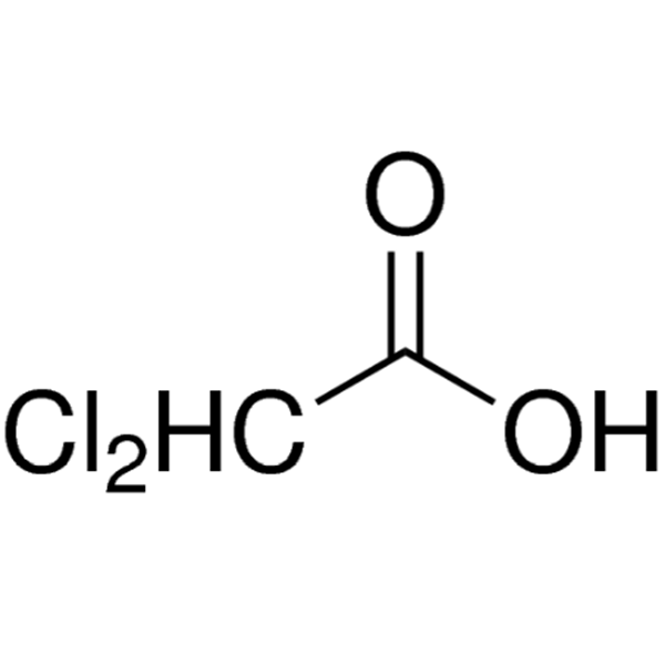 ジクロロ酢酸 (CAS: 79-43-6) は、α- 位に 2 つの塩化物を持つ単純なハロゲン化酢酸化合物です。腐食性、可燃性、無色の刺激臭のある強い液体の酸です。水とアルコールに溶けます。ジクロロ酢酸 (Ka=5.14 × 10-2) はクロロ酢酸よりも強い酸です。ほとんどの化学反応はクロロ酢酸の反応と似ていますが、どちらの塩素原子も反応しやすいです。ジクロロ酢酸は、クロロ酢酸よりも加水分解に対してはるかに安定です。有機合成における反応性中間体です。ジクロロ酢酸は、酢酸の塩素化によって製造されます。