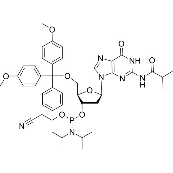 DMT-dG(Ib) ホスホラミダイト (CAS: 93183-15-4) は、DNA および RNA 分子の合成に使用されるヌクレオシド類似体の一種です。これは、デオキシリボース糖、窒素含有塩基 (グアニン)、およびホスホラミダイト リンカー グループで構成される修飾ヌクレオシドです。ホスホラミダイト リンカー グループは、DMT-dG(ib) ホスホラミダイトに独特の特性を与え、さまざまな用途での使用を可能にします。