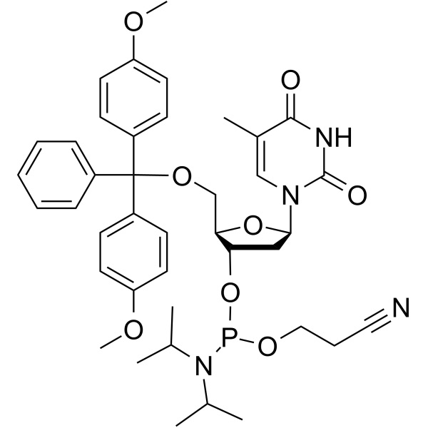 | 同義語 | 5'-O-DMT-チミジン 3'-CE ホスホロアミダイト; 5'-O-DMT-2'-デオキシチミジン-3'-CE ホスホロアミダイト; 5'-ジメトキシトリチル-3'-デオキシチミジン 2'-[(2-シアノエチル)-(N,N-ジイソプロピル)]-ホスホロアミダイト; 5'-O-(4,4'-ジメトキシトリチル)-2'-デオキシチミジン-3'-(2-シアノエチル-N,N-ジイソプロピル)ホスホルアミダイト; 5'-O-[ビス(4-メトキシフェニル)(フェニル)メチル]-3'-O-[(2-シアノエトキシ)(ジイソプロピルアミノ)ホスフィノ]チミジン; 5'-O-[ビス(4-メトキシフェニル)PhMe]-チミジン 3'-[2-シアノエチル N,N-ビス(1-メチルエチル)ホスホロアミダイト] |