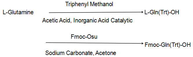 Fmoc-Gln(Trt)-OH は、ほとんどの有機溶媒に対して良好な溶解特性を備えており、これを使用すると、Gln の導入に使用される他の誘導体よりも大幅に純粋なペプチドが得られることが示されています。結合は標準的な手順で実行できます。トリチル保護基は、通常、Trpのアルキル化を伴わずに、95% TFAにより1〜3時間で除去される。