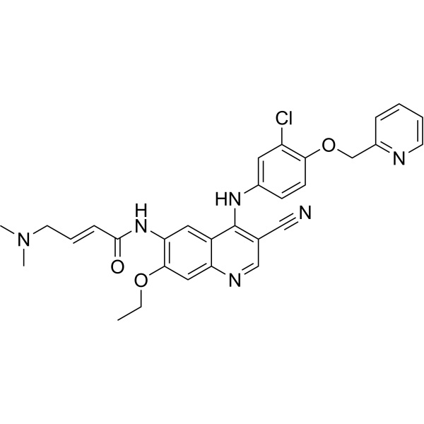 | 同義語 | HKI-272; HKI272; HKI 272; (2E)-N-[4-[3-クロロ-4-(2-ピリジニルメトキシ)アニリノ]-3-シアノ-7-エトキシ-6-キノリニル]-4-(ジメチルアミノ)-2-ブテンアミド |